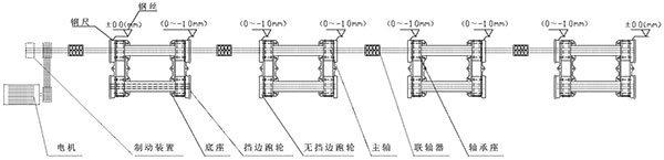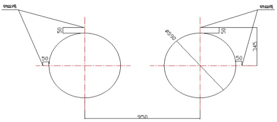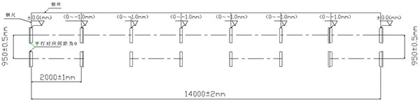 第二次調(diào)整:①卸下全部的夾軸器,按照以上粗調(diào)的步驟來精調(diào)離心機(jī)的水平精度;②調(diào)整要求:水平方向,調(diào)整主、從動(dòng)輪軸承座旁的調(diào)節(jié)螺釘使主動(dòng)軸與副軸中心線在同一水平面上間距為950mm,兩端的寬度差(平行度)≦±0.5mm;垂直方向各輪的水平度誤差±1mm,前后輪略高0.5mm;調(diào)整各組跑輪使長度方向中心距為2000mm±1mm,總托輪距累積誤差≦±2mm。③帶擋邊主、副輪與模具接觸面要對應(yīng)對齊,調(diào)整后要鎖緊,防止工作時(shí)移位(圖示一);④底部的墊鐵、斜鐵要打緊,緊定好螺母,重新裝好夾軸器,進(jìn)行第二次灌漿。