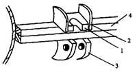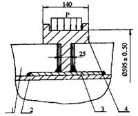 ②從整體結(jié)構(gòu)上看,跑輪將模身的加強(qiáng)部分正腹板和側(cè)腹板攔腰分段割斷,使其連不成整體,削弱了腹板加強(qiáng)抗彎性能的作用。 ③跑輪材料為鑄鋼ZG270-500,而其余材料為Q235A,兩種材料的硬度有大的差異,焊接有一定難度。從現(xiàn)場(chǎng)生產(chǎn)來看,使用時(shí)間長(zhǎng)的模具,腹板與跑輪的焊縫處易出現(xiàn)裂縫。 因此,建議將模身結(jié)構(gòu)改動(dòng)。 1.2 改進(jìn)結(jié)構(gòu)的優(yōu)點(diǎn) 正腹板和側(cè)腹板直接與跑輪中心板(厚度25mm)焊接,并將正腹板厚度由10mm改為15mm,如圖3。 ![]() 圖3 1-正腹板(或側(cè)腹板);2-模身板;3-接合板;4-跑輪;