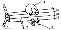 這種設(shè)計(jì),從外觀看似乎很牢固,而實(shí)際上,用材料太單薄,鎖孔位單薄,所以導(dǎo)致“U型”模耳被合模受力壓迫時(shí),易向兩邊叉開,甚至斷裂。損壞后,很難用加筋板修補(bǔ)。初期,我廠要派2位維修工人每日專職修補(bǔ)這種模耳,但修補(bǔ)后使用不到2天又破壞。為此,常州生產(chǎn)廠家三次派技術(shù)人員到本廠,均未想出好的修補(bǔ)措施。全批模具處于癱瘓狀態(tài),嚴(yán)重阻礙生產(chǎn)。后來,筆者根據(jù)實(shí)踐分析,提出改造方案。 3.2 改造方案如圖6。 ①將原模耳突出模邊板的部分割去,但不能割其它部份,否則會(huì)引起嚴(yán)重變形,導(dǎo)至整條模具報(bào)廢。 ![]() 圖6 1-上模墊板(厚20mm);2-筋板(厚8mm);3-下模筋板(厚20mm);4-模邊板;