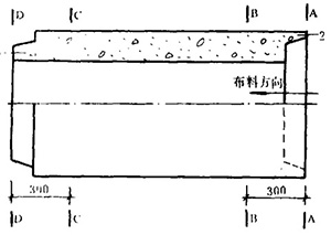 2. 當(dāng)水泥制管機(jī)達(dá)到布料規(guī)定的轉(zhuǎn)速后,用喂料機(jī)在B-B截面上先布置一個(gè)寬度約為200mm的混凝土拌合物料帶。料帶厚度達(dá)到管子壁厚時(shí),再用喂料機(jī)沿B-B截面向A-A截面均速喂料,直至到達(dá)A-A截面。料層厚度控制在比水泥管模具兩端環(huán)高出3-4mm為宜。這樣,由于B-B截面處料帶的擠壓作用和輥壓作用,易使外包口的混凝土得到密實(shí)。