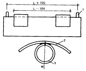 3. 然后用喂料機(jī)由B-B截面喂至D-D截面。如果是有筋管,為防止骨架產(chǎn)生扭曲變形,可在A-A截面布料結(jié)束后,先從C-C截面向D-D截面布料,最后從B-B截面向C-C截面布料,直至結(jié)束。 三、小口徑企口管的吊運(yùn)與脫模 400-800mm的小口徑企口管,按GB11836國(guó)標(biāo)規(guī)定,最小壁厚只有40mm,所以,企口部位的混凝土厚度是很小的。這樣小的厚度,如采用倒模方式脫模,勢(shì)必造成廢品或次品,為了解決這個(gè)問(wèn)題,我們自行設(shè)計(jì)了一種專用脫模吊運(yùn)工具(如圖2)。脫模時(shí),在水泥管模具上半模起吊脫離后,把專用工具伸入管內(nèi),然后用行車起吊,即可使水泥管與下半模脫離。 ![]() 圖2 專用工具示意圖 1-水泥管公稱長(zhǎng)度;R-水泥管外半徑;1-吊鉤;2-A3鋼板;δ=8-10mm;3-Φ74×鋼管;