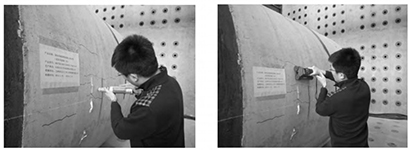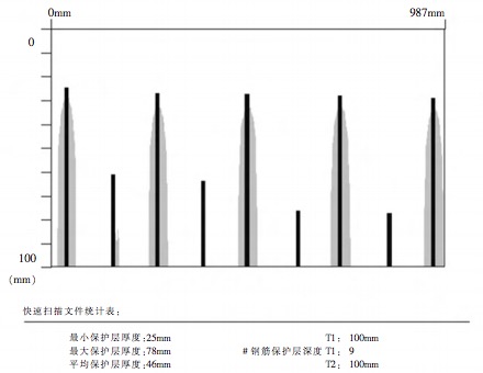 2.2 混凝土強(qiáng)度及鋼筋信息檢測(cè) 混凝土強(qiáng)度采用回彈儀進(jìn)行檢測(cè),水泥管鋼筋數(shù)量、間距及保護(hù)層厚度采用PS200鋼筋探測(cè)儀進(jìn)行檢測(cè),F(xiàn)場(chǎng)無(wú)損檢測(cè)情況見圖 3、圖 4,圖5為雙層縱筋保護(hù)層厚度、間距、鋼筋掃描圖像,圖中縱坐標(biāo)為保護(hù)層厚度,橫坐標(biāo)為鋼筋間距,線條為鋼筋圖像。 ![]() 圖3 回彈法檢測(cè)混凝土強(qiáng)度 圖4 鋼筋信息檢測(cè) 由于水泥管縱筋及環(huán)向鋼筋在管內(nèi)、外側(cè)均雙層配置,因此,內(nèi)外鋼筋位置、保護(hù)層等信息以圖像高低不同進(jìn)行區(qū)分,即圖像較高(保護(hù)層厚度較小)為外側(cè)鋼筋。 ![]() ![]() 圖5 雙層縱筋保護(hù)層厚度、間距、鋼筋圖像 圖6 環(huán)向鋼筋分布 圖6為環(huán)向鋼筋信息掃描圖像,因鋼筋探測(cè)儀根據(jù)電磁感應(yīng)原理工作,檢測(cè)時(shí)探頭應(yīng)垂直于鋼筋位置,而水泥管的環(huán)向鋼筋與縱軸線有一定傾斜角度,故鋼筋檢測(cè)掃描圖像中縱坐標(biāo)保護(hù)層厚度非直線,說明保護(hù)層厚度因角度不同存在偏差,但呈對(duì)稱分布,中間最高處為環(huán)向筋實(shí)際保護(hù)層厚度,水泥管混凝土強(qiáng)度及鋼筋檢測(cè)結(jié)果見表2。