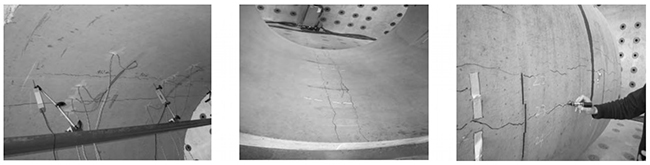二、外壓荷載試驗(yàn) 采用“三點(diǎn)法”對(duì)水泥管進(jìn)行加載試驗(yàn),測(cè)試水泥管的裂縫荷載和破壞荷載,外壓荷載試驗(yàn)的加載裝置如圖7所示。在上承鋼梁集中一點(diǎn)加荷,通過鋼梁對(duì)試件施加均布線荷載,為保證荷載均勻,在鋼梁與試件間設(shè)置橡膠墊板,試件下方的兩個(gè)下支承梁與上承梁的軸線相互平行。規(guī)范規(guī)定裂縫寬度達(dá)到0.2mm時(shí)的荷載為管的裂縫荷載,當(dāng)試件喪失承載能力時(shí)為破壞荷載。試驗(yàn)加載速度每分鐘30kN/m,試驗(yàn)時(shí)裂縫寬度應(yīng)用裂縫測(cè)寬儀測(cè)讀,裂縫測(cè)量見圖8。試件加載過程中,試件內(nèi)壁頂部和底部幾乎同時(shí)開裂,內(nèi)壁頂部裂縫寬度比底部發(fā)展快,在試件的軸線附近有明顯的主裂縫。外壁水平側(cè)面相對(duì)開裂較晚,有2條明顯的主裂縫,內(nèi)壁側(cè)面未發(fā)現(xiàn)裂縫。當(dāng)加載至破壞荷載時(shí),在管口部位出現(xiàn)沿管壁的環(huán)向裂縫,并伴有炸裂聲響,說明混凝土與鋼筋間發(fā)現(xiàn)相對(duì)滑移,試件達(dá)到極限破壞。部分裂縫分布見圖9,外壓荷載試驗(yàn)檢測(cè)結(jié)果見表3。 ![]() ![]() 圖7 試驗(yàn)加載 圖8 裂縫寬度測(cè)量 ![]() 圖9 管頂、管底、管側(cè)向裂縫分布